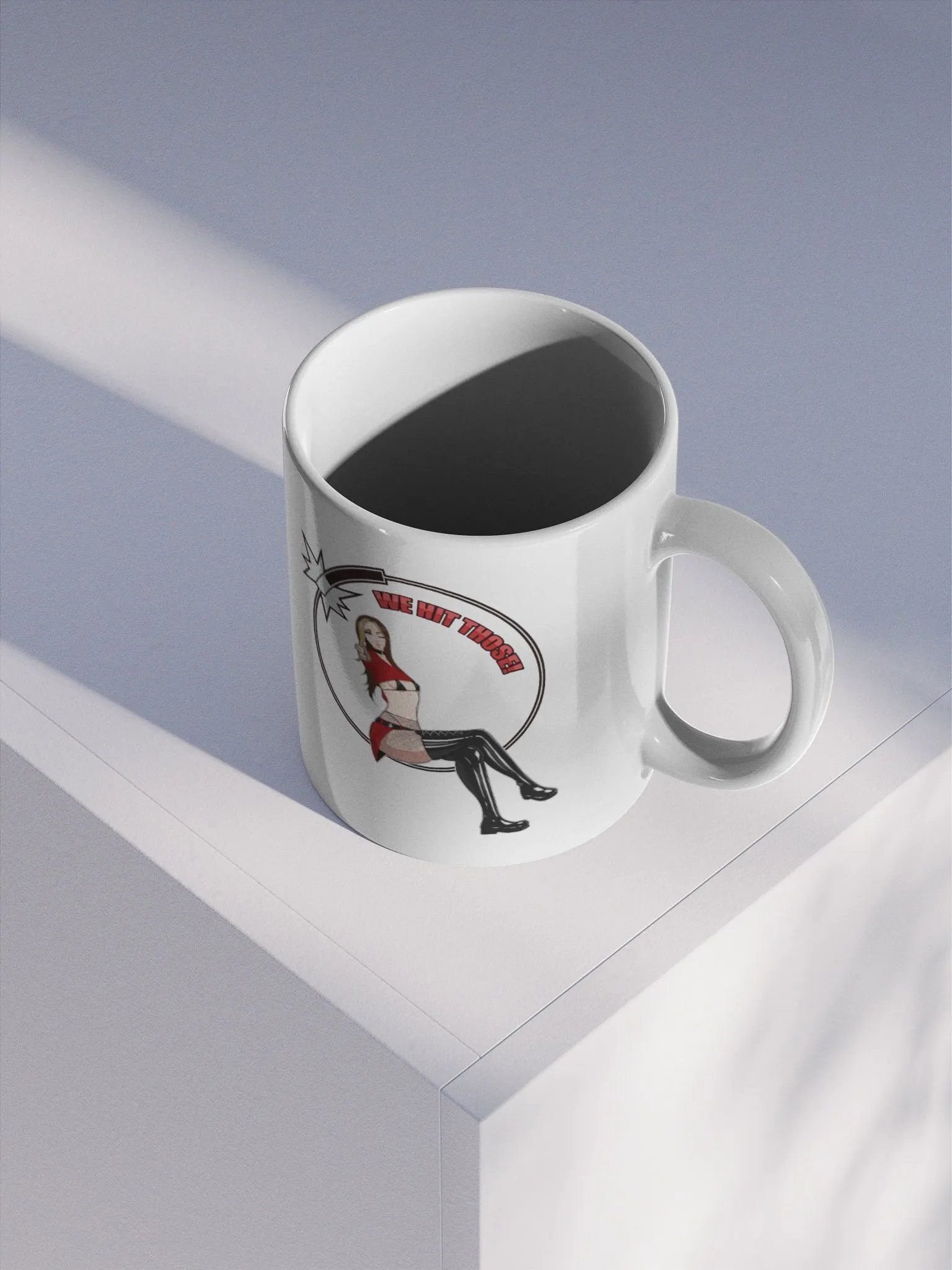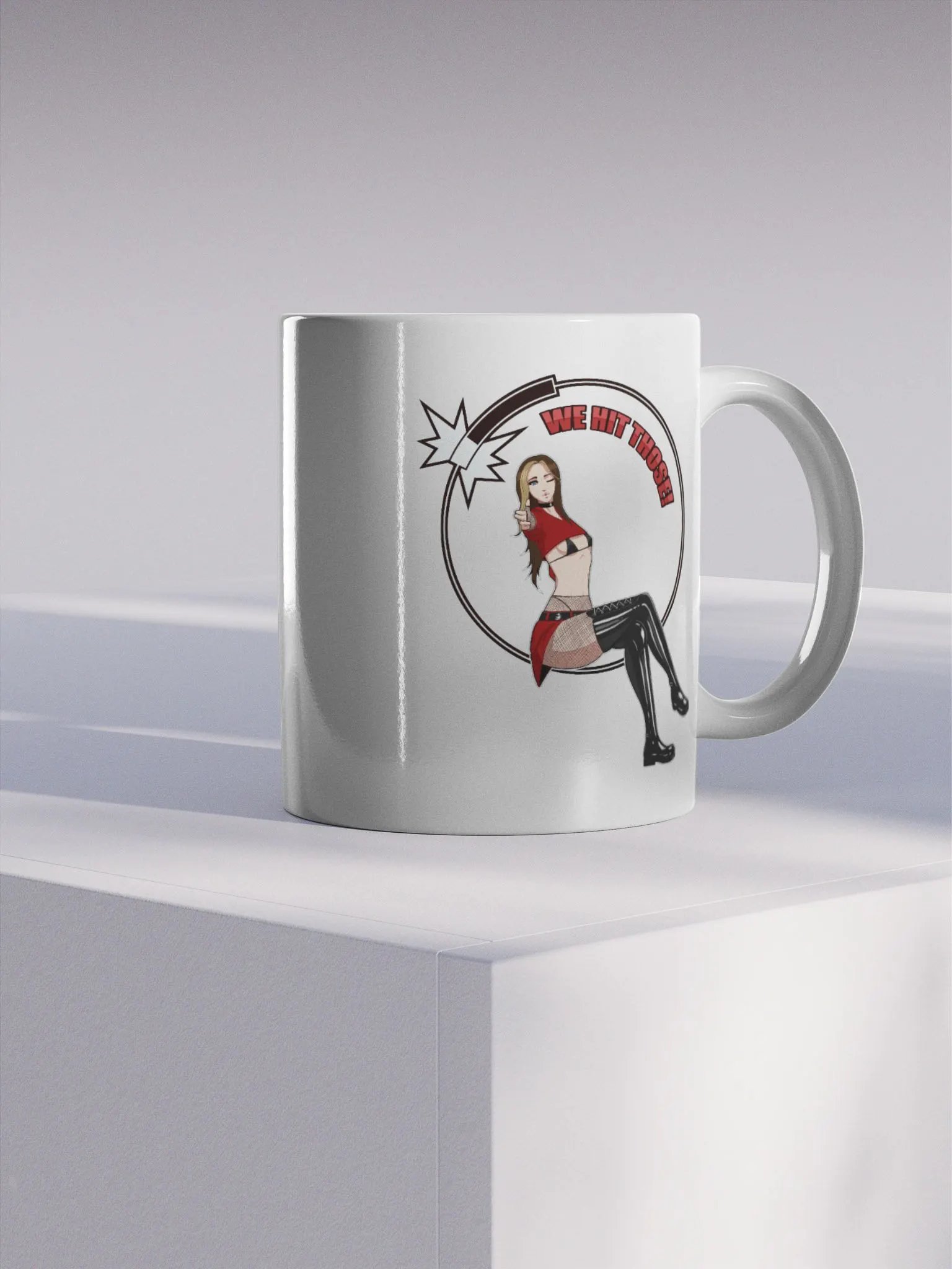 White mug with Xaphs "We Hit Those" logo on it. Art by Fuxxim! || ✅ Microwave and dishwasher safe!